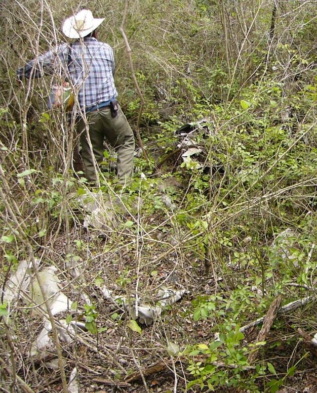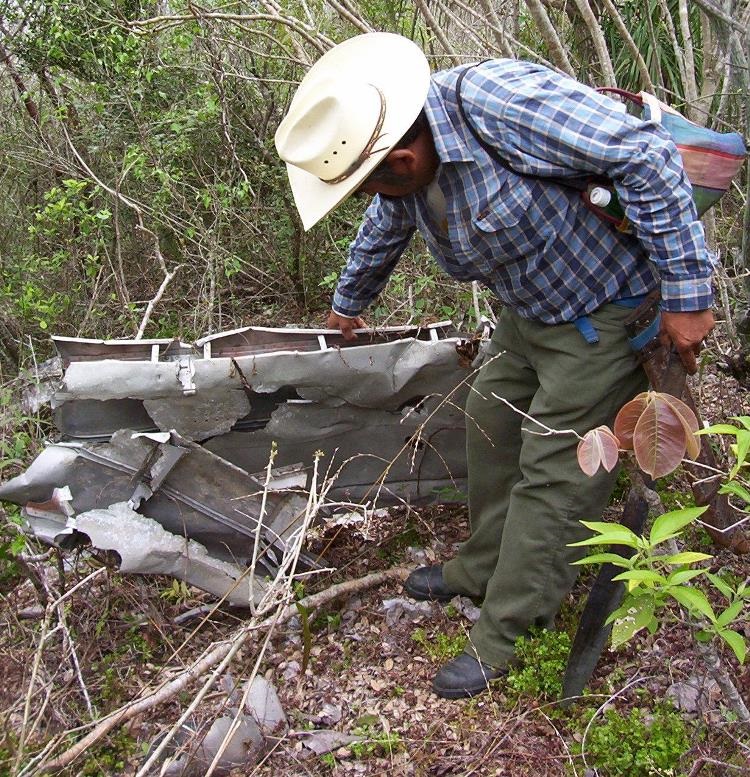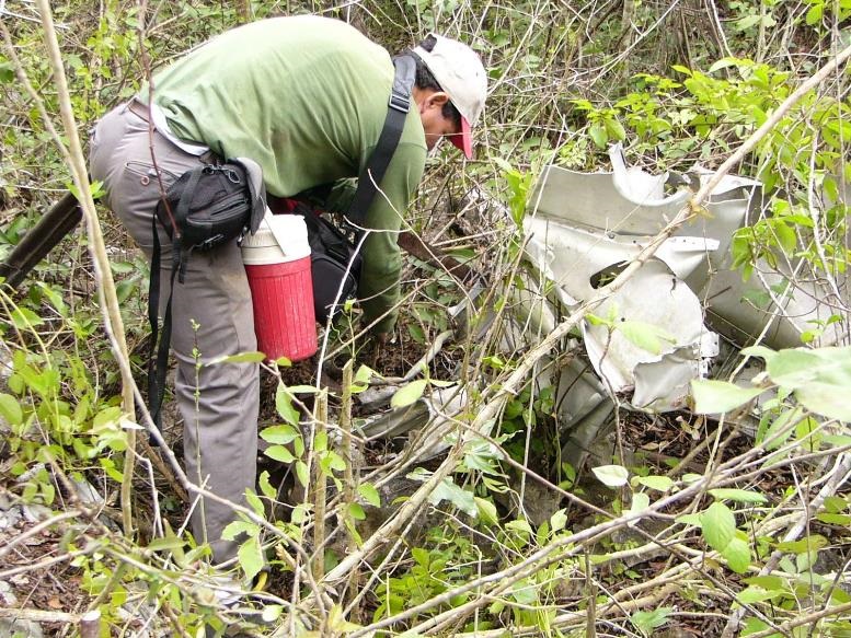 Nos encontrábamos en la parte más alta, desde donde divisamos –hacia el poniente- la carretera nacional y la presa “La lajilla”; habían pasado poco más de cuatro horas de caminata, estábamos a 660 metros sobre el nivel del mar (msnm), en las coordenadas 2467445 norte y 14 507087 este. Un poco más adelante, vimos esparcidos en un radio de aproximadamente 50 metros, todo tipo de desechos de la unidad C-60 de Jorge Pasquel.