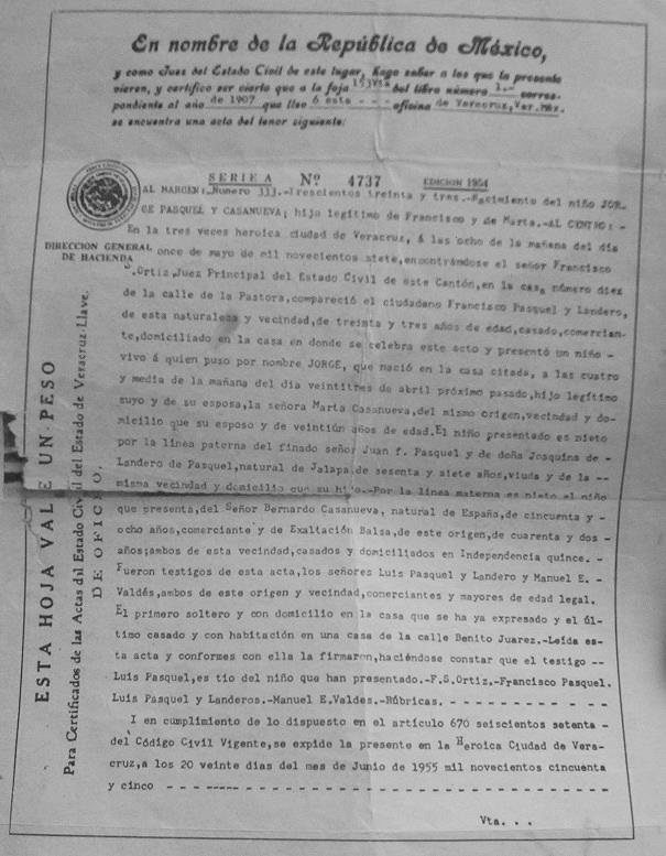 Jorge Pasquel Casanueva nació el 23 de abril de 1907 en Veracruz; de carácter extrovertido, palabra fácil, capaz de la broma pesada y conocido por sus reacciones fuertes. Alguna vez un compañero lo lastimaba con sus palabras, pero Jorge sacó un cortaplumas arrojándose contra su ofensor, ambos lucharon bravamente hasta que un maestro los separó y lo expulsó de esa Secundaria de la ciudad de México.