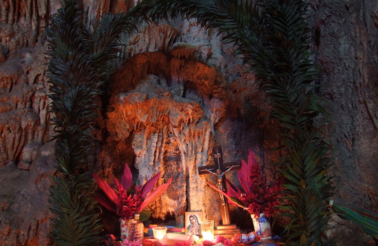 Además, los sentidos vuelven a dejarse llevar y llaman a introducirse. Primero, la vista: Recorriendo toda la amplia cámara con sus decenas de formaciones alrededor, esa mañana alumbrada con el resplandor rojizo que dejan las velas acomodadas en el piso, frente a un altar diseñado por la naturaleza entre las rocas, adornado con la verde palmilla, donde sobresalen efigies muy conocidas por el catolicismo.